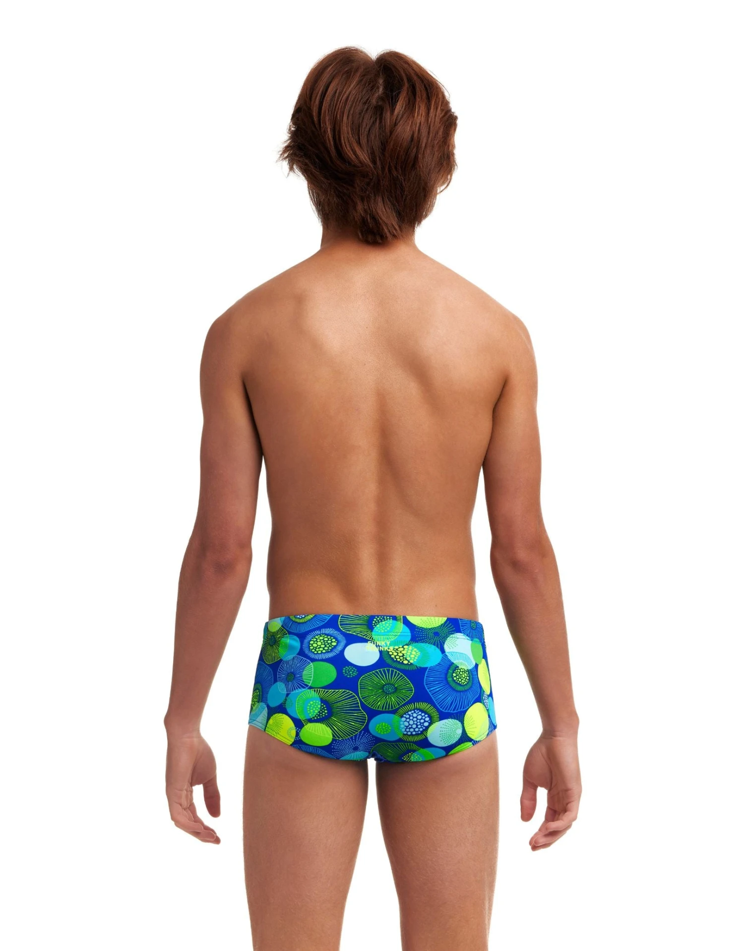 The Boys Blue Bottle Swim Trunks from Funky Trunks are ideal swimwear for frequent pool use for recreational and performance based swimming. With a drawcord, it keeps your trunks in position, and the wide elastic leg opening and waistband add comfort around your hips and legs while swimming. The trunks are made from exclusive C-Infinity fabric and offer great durablility and high chlorine resistance. Â
