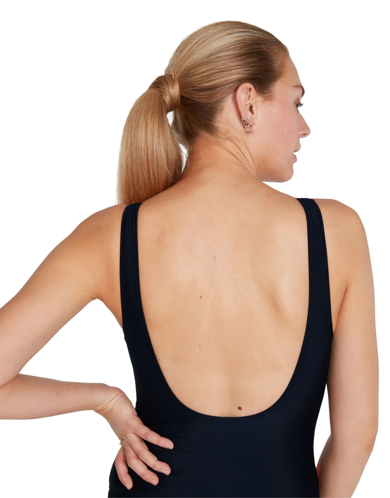 This striking swimsuit from Speedo showcases a captivating abstract design, inspired by the lush foliage of tropical paradises. Designed to accompany you on beach getaways and leisurely poolside moments, it has a scoop neck and a U-back design. ECO EnduraBrite fabric ensures exceptional colour performance, and high chlorine resistance with CREORA® HighClo™ and is made from 100% recycled materials.