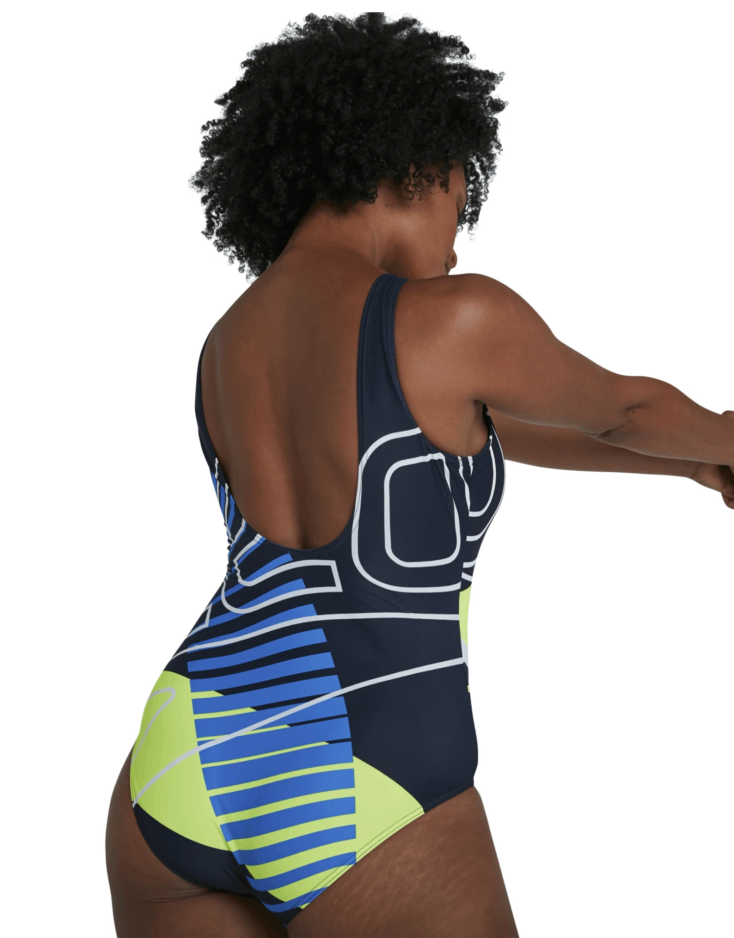 A 90’s inspired Speedo Core Placement U-Back Swimsuit, with racing stripes, blocks of colour, and bold branding. This retro-style swimsuit is perfect for 90’s sportswear revival. Also being made from Endurance10 fabric, it means this swimsuit will last you longer than traditional swimwear fabrics.