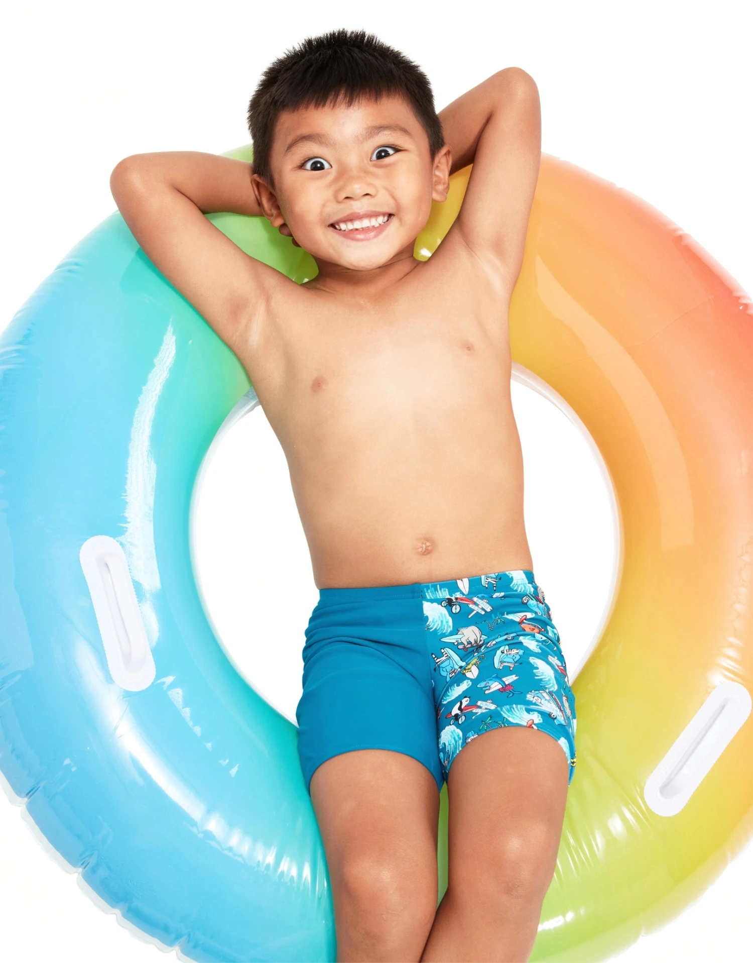 The Speedo Boys Digital Allover Jammer in Pluto Blue boast a lively design with surf-loving characters as they head to Bondi Beach. Ideal for the pool and the beach, this jammer style offers more coverage than shorts and fits just above the knee. The soft and stretchy Endurance10 fabric paired with Creora HighClo keeps these jammers fitting like new for longer.Â