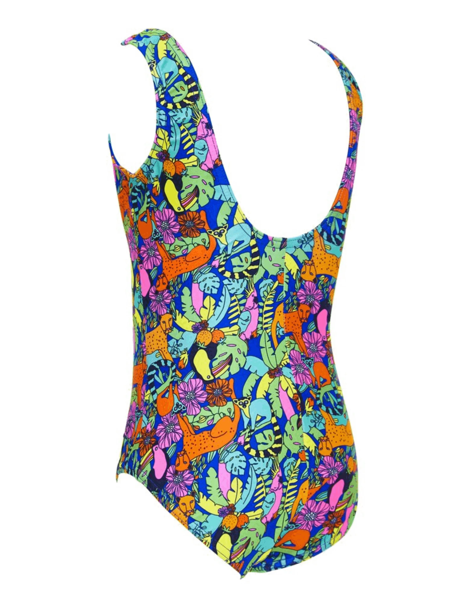 The Zoggs Girls Jungle Scoopback Multi One Piece is created with a multicoloured fun design. The open scoopback provides great freedom of movement so your little one can jump around and also makes getting them in and out of their swimming costume a whole lot easier for you. Made from Zoggs’ Eco Friendly, Chlorine Resistant Ecolast fabrication and available for girls up to 6 years.